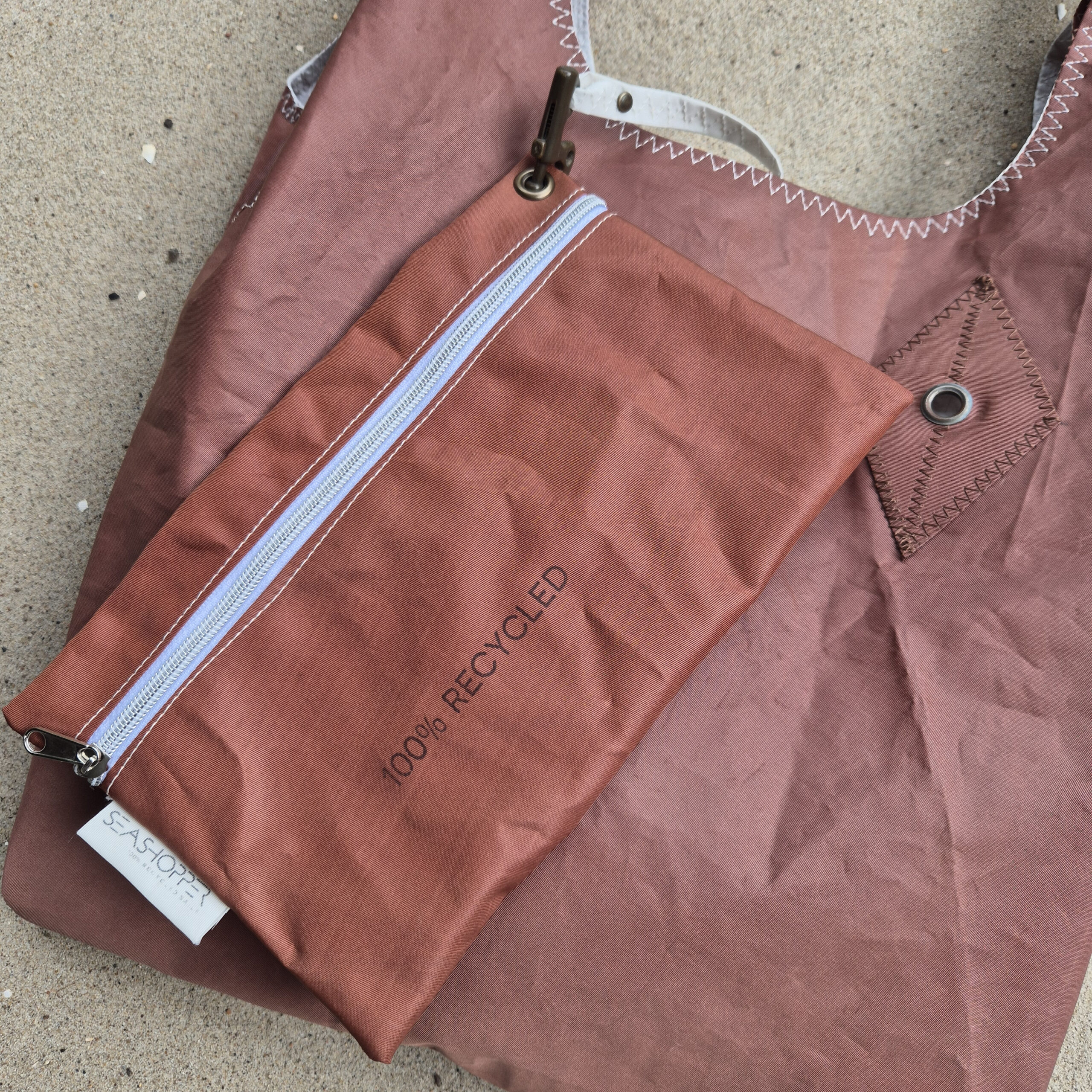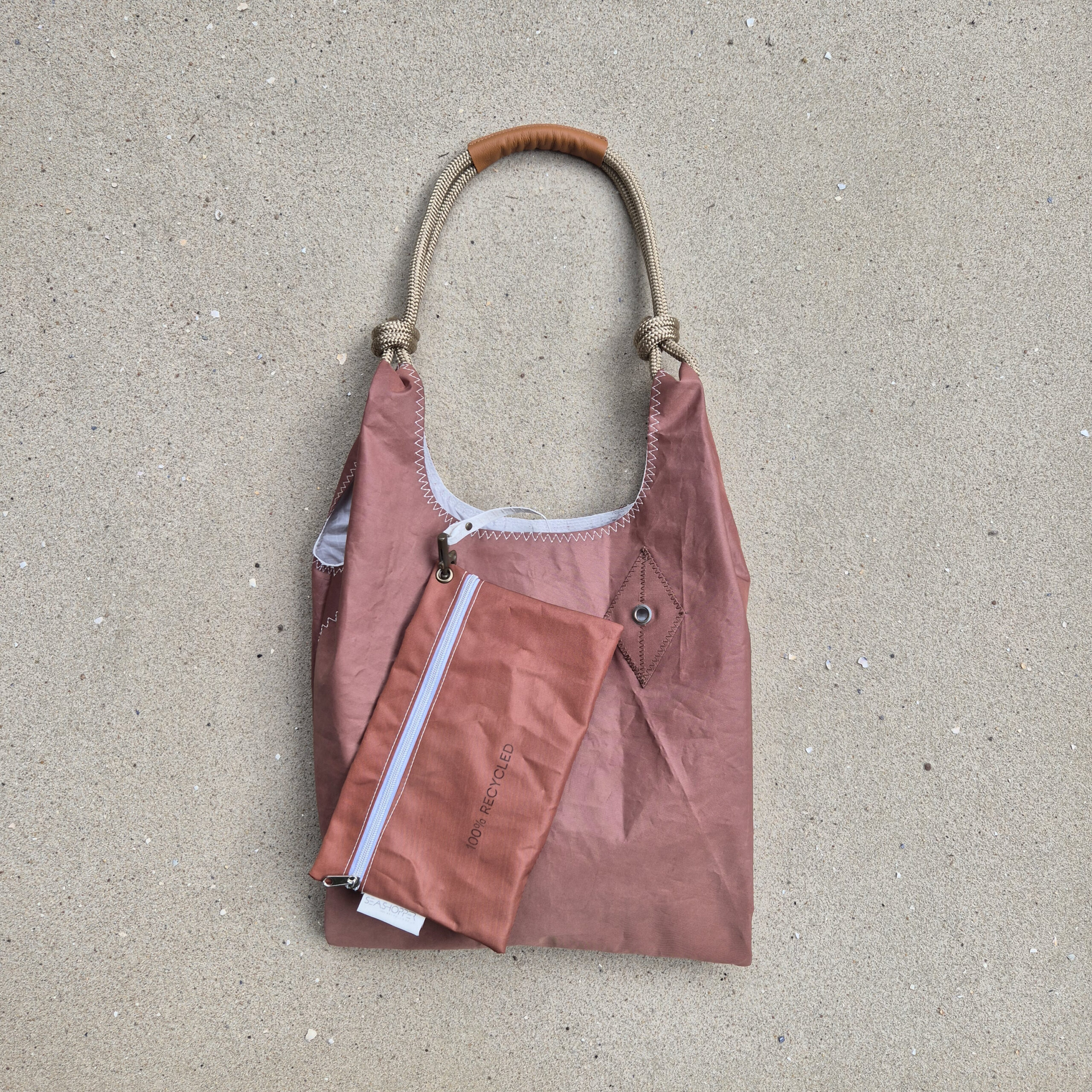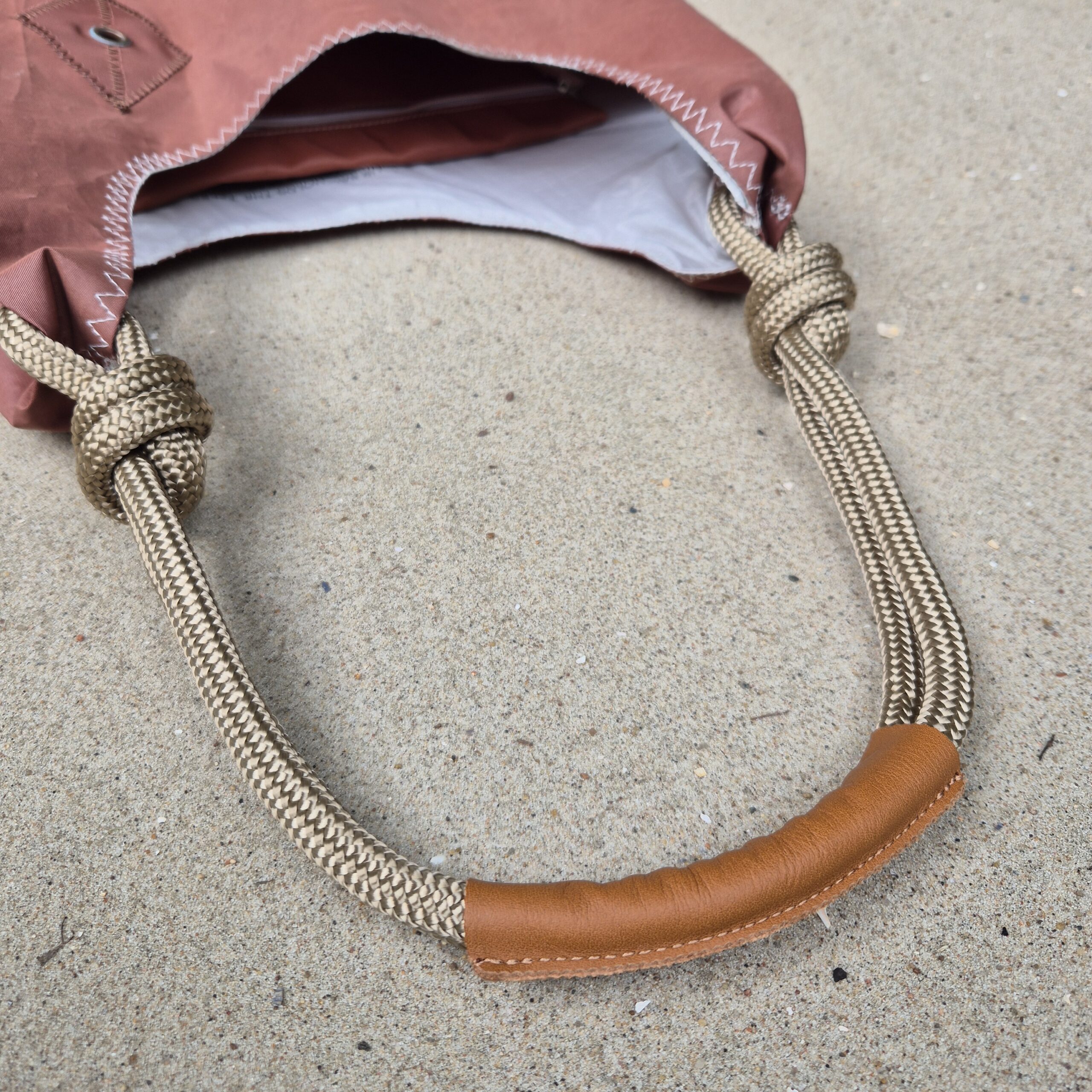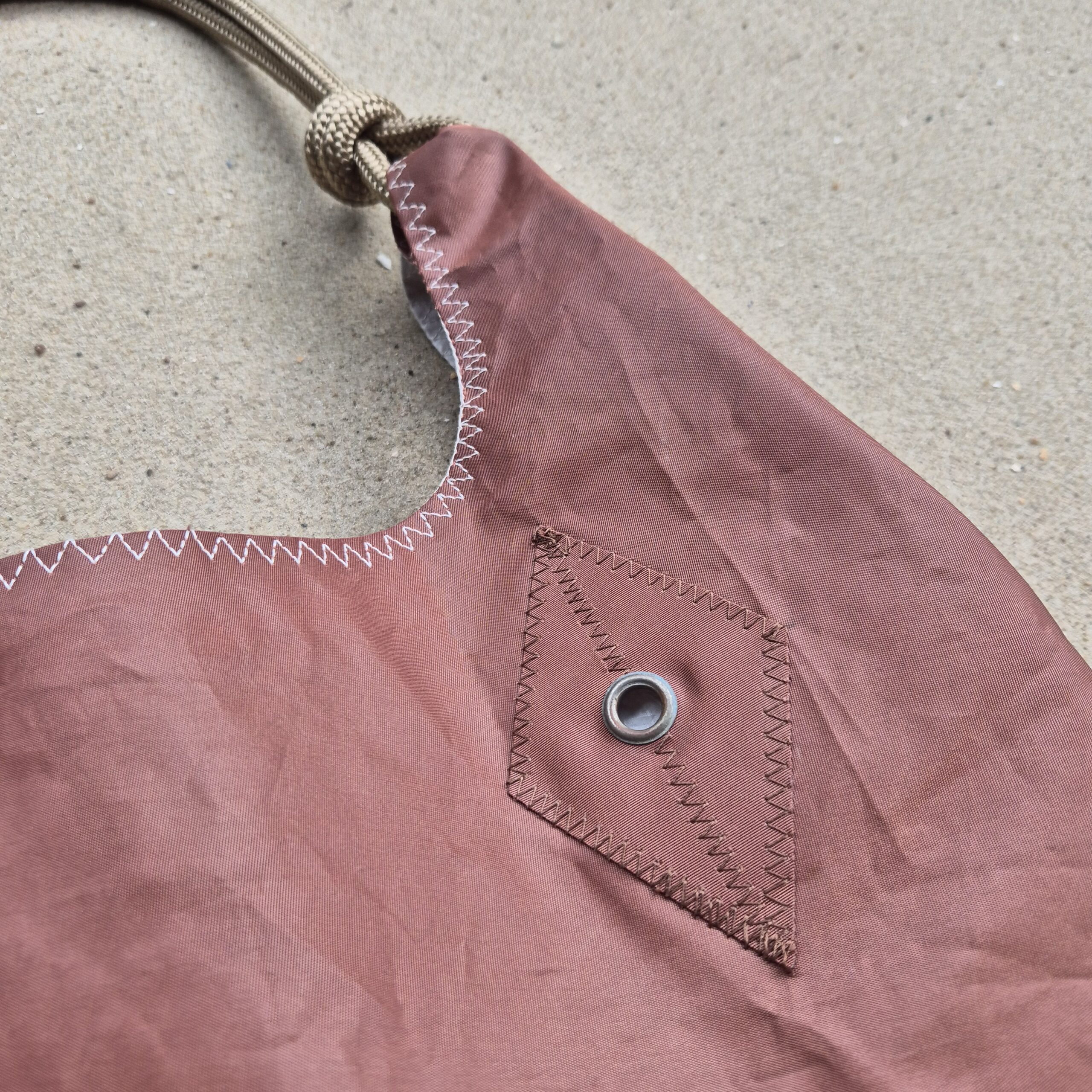 Torebka damska uszyta z brązowego dakronowego żagla. Wnętrze z białego żagla typu spinaker gwarantuje większą sztywność. Nie ma dwóch identycznych toreb. Każda torba jest unikatowa. Ma oryginalne szwy, fragmenty starych numerów rejestracyjnych jachtu, stalowe oczka czy naszycia.