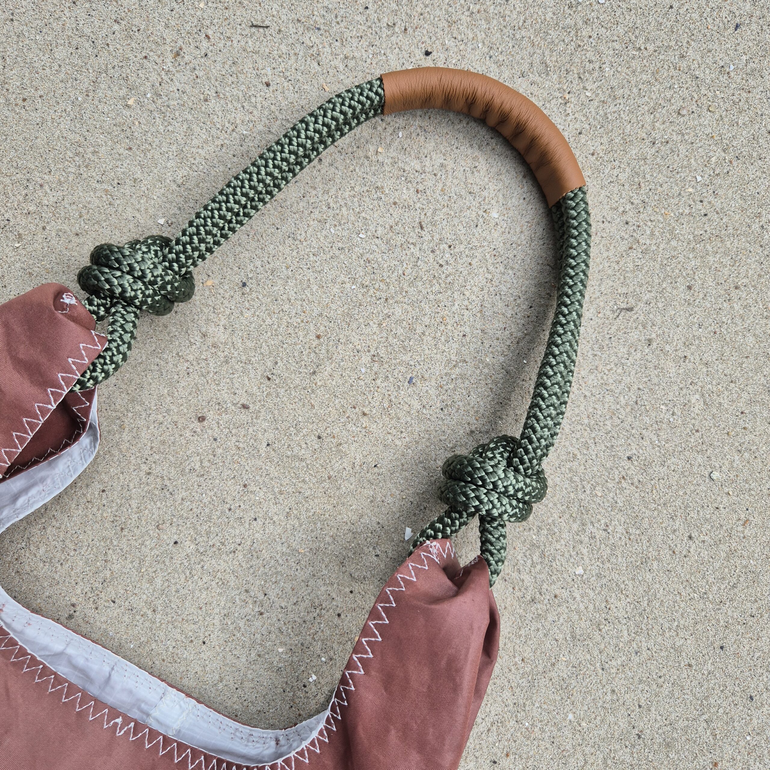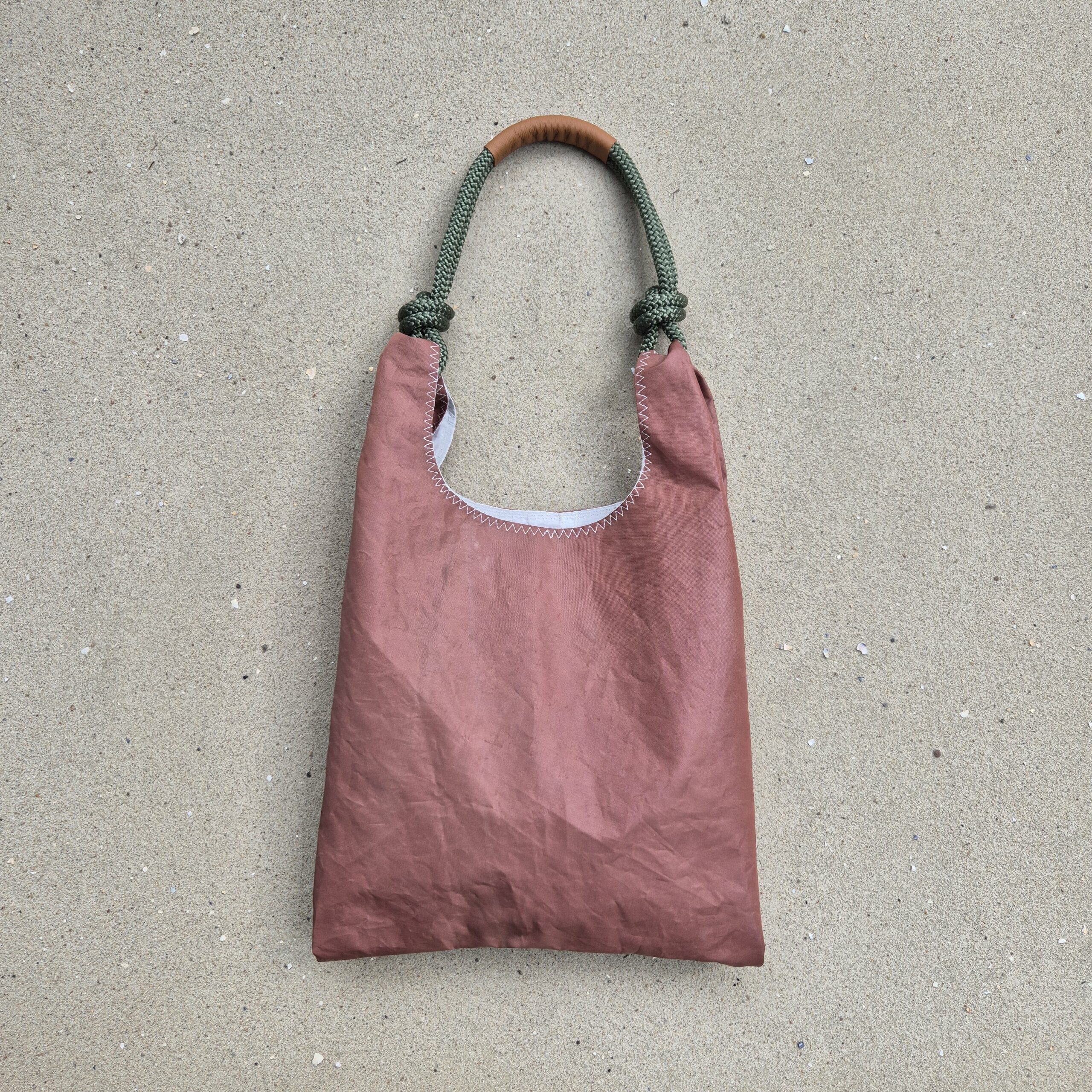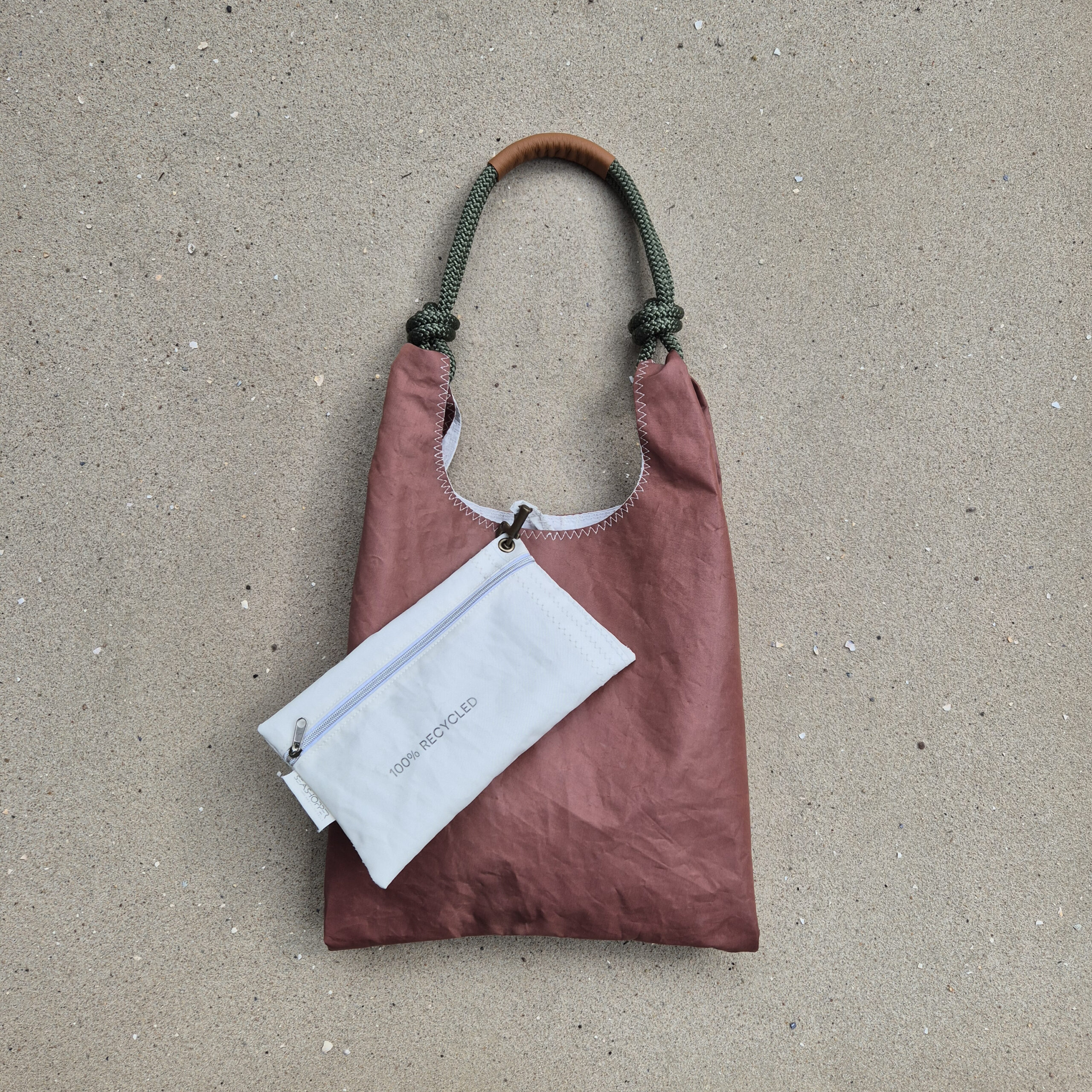 Torebka damska uszyta z brązowego dakronowego żagla.  Wnętrze z białego żagla typu spinaker gwarantuje większą sztywność. Nie ma dwóch identycznych toreb. Każda torba jest unikatowa. Ma oryginalne szwy, fragmenty starych numerów rejestracyjnych jachtu, stalowe oczka czy naszycia.