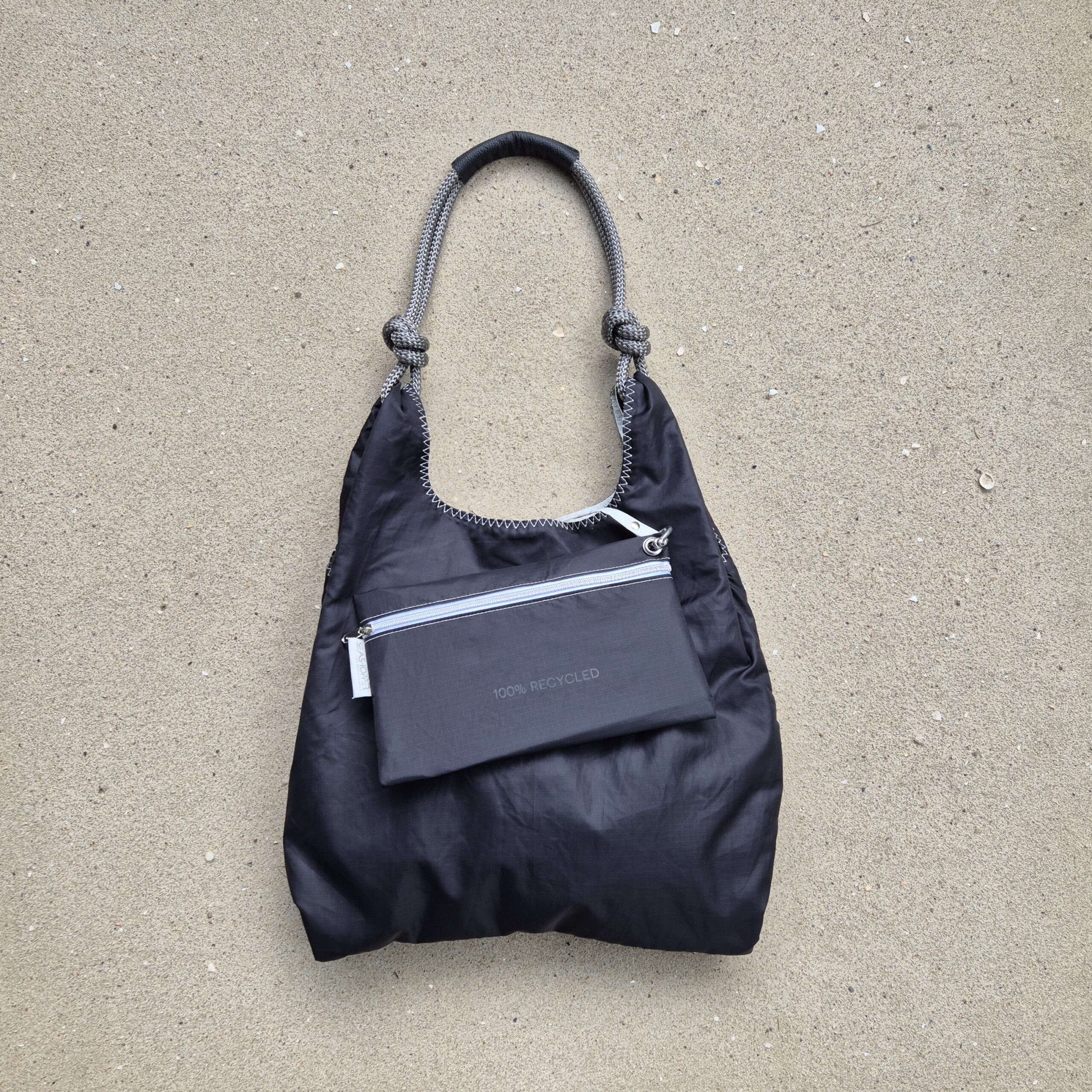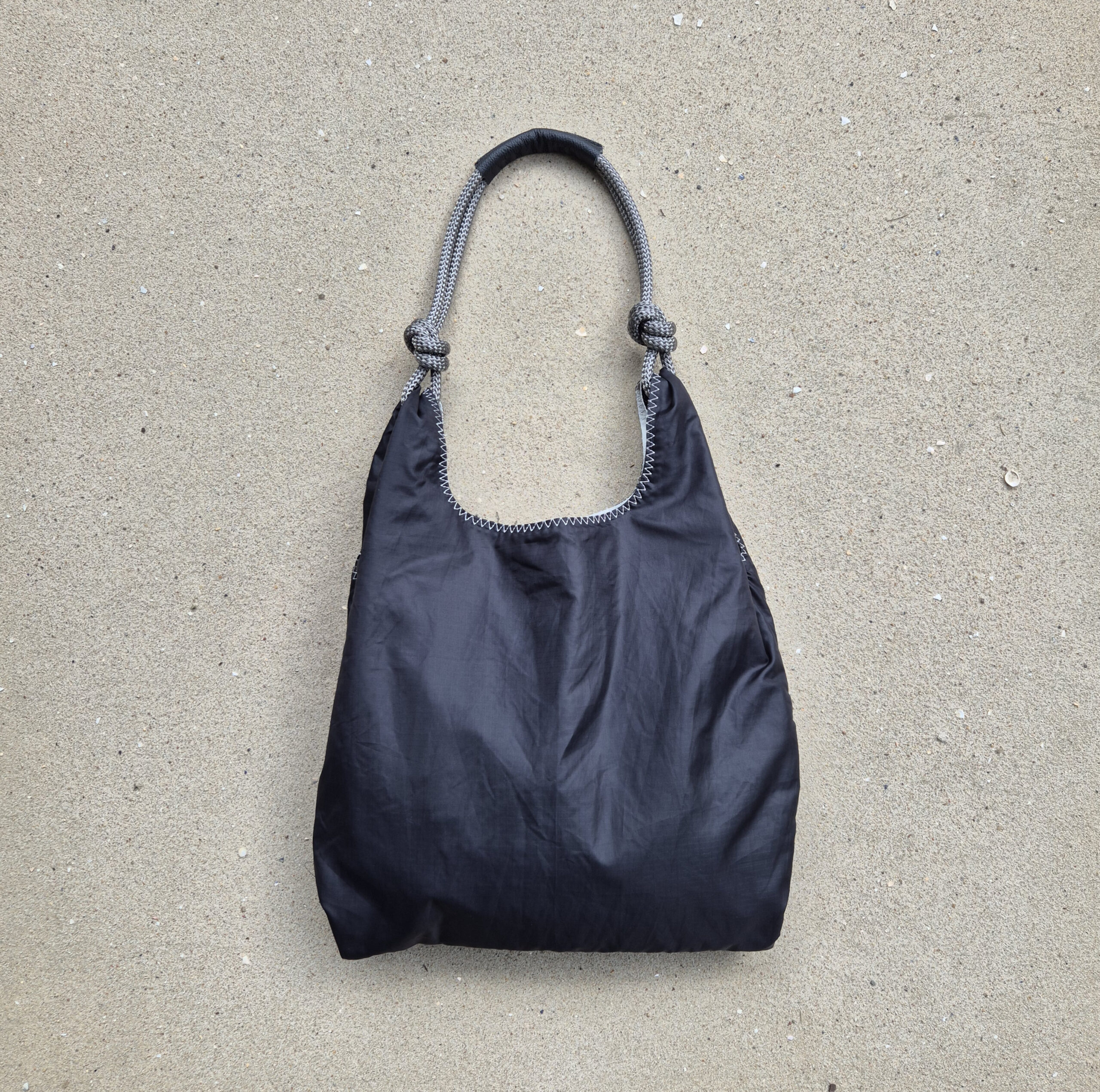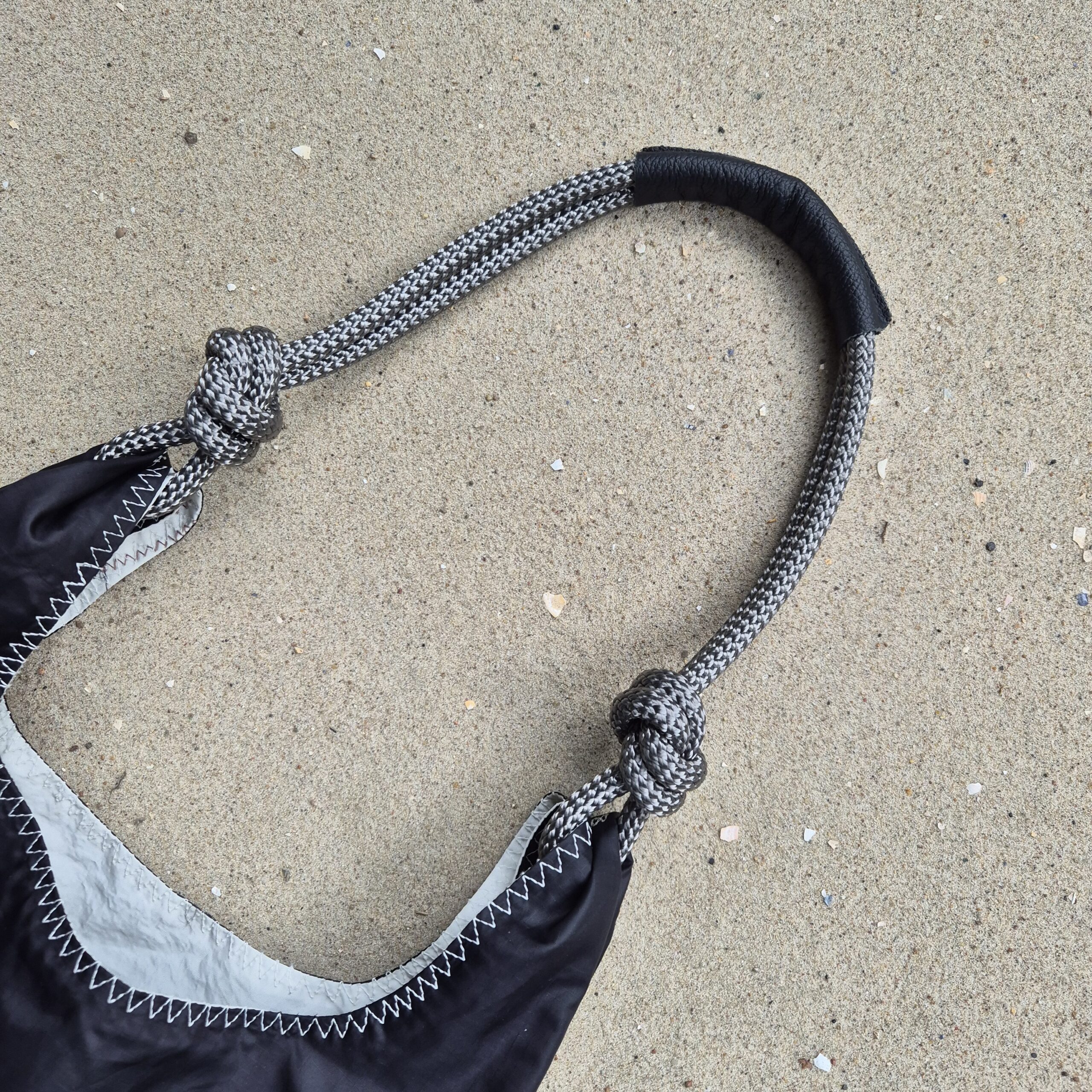 Torebka damska uszyta z lekkiego żagla typu spinaker w czarnym kolorze. Wnętrze z białego żagla dakronowego gwarantuje większą sztywność. Nie ma dwóch identycznych toreb. Każda torba jest unikatowa. Ma oryginalne szwy, fragmenty starych numerów rejestracyjnych jachtu, stalowe oczka czy naszycia.