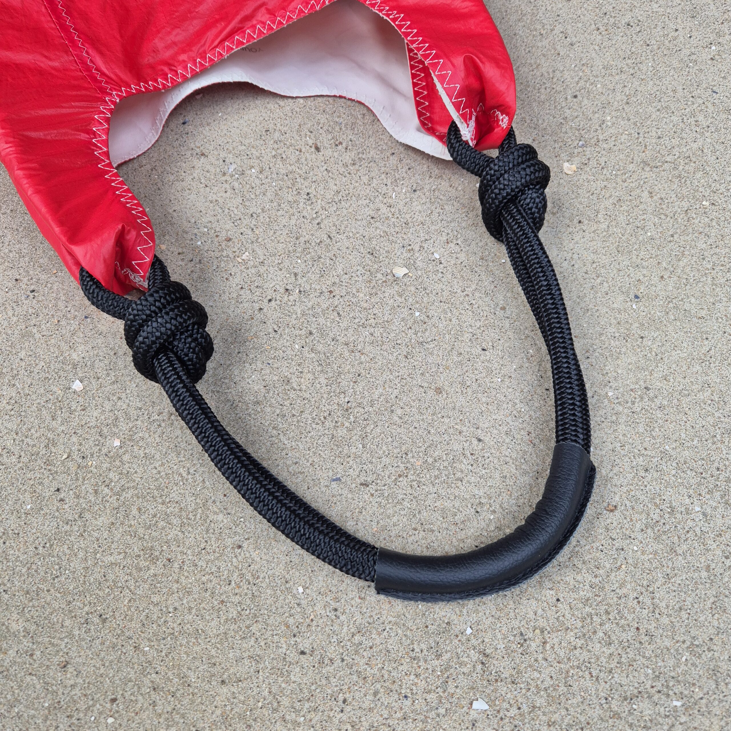 Ta czerwona torba z żagli to połączenie funkcjonalności, historii i wyjątkowego stylu. Uszyta z czerwonego żagla typu spinaker, ma wnętrze z białego żagla, które dodaje jej sztywności i charakteru. Każdy egzemplarz jest jedyny w swoim rodzaju – z oryginalnymi szwami, fragmentami numerów rejestracyjnych jachtów i metalowymi oczkami, które nadają torbie autentyczny, morski charakter.